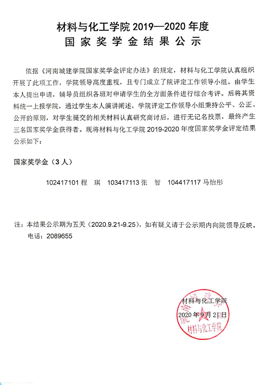 材料与化工学院2019-2020年度国家奖学金结果公示
